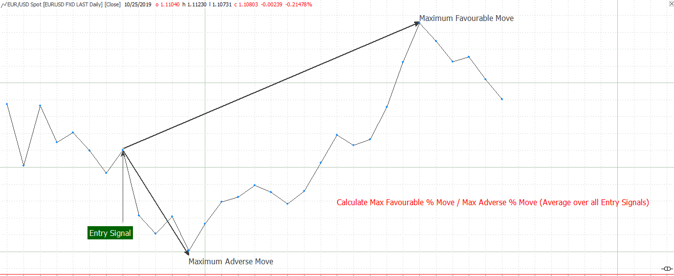 If the ratio of the favourable moves vs the adverse moves is greater than one, your entry has got some edge. On the chart shown above the ratio would only get above one after 17 data points. Before that, the adverse move would have been bigger than the favourable move.