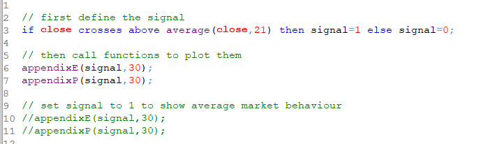 The indicator code above gives a simple example on how to do it. You could also call the function in an existing trading strategy, and just set the signal to 1 or -1 each time a trade is opened. Then compare the results of the APPENDIX analysis to the average holding period of your strategy. If, on average, your strategy stays in the market for a longer time than APPENDIX would suggest, you might want to work on a faster exit strategy.