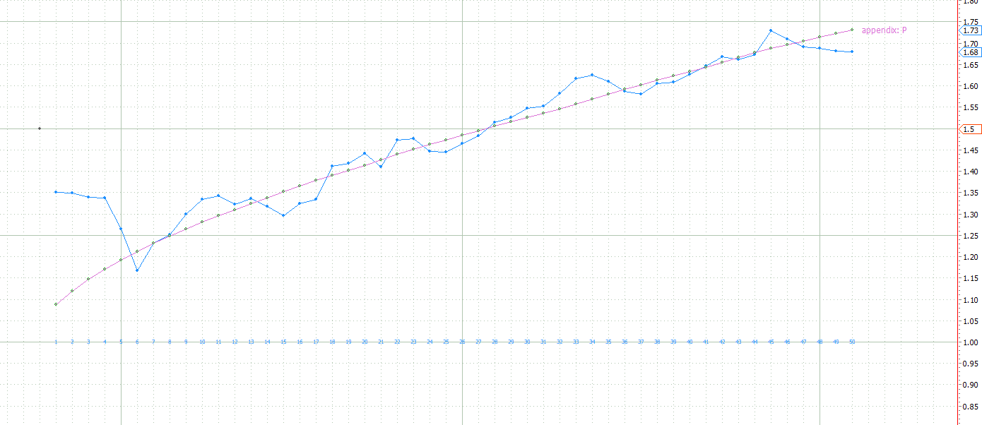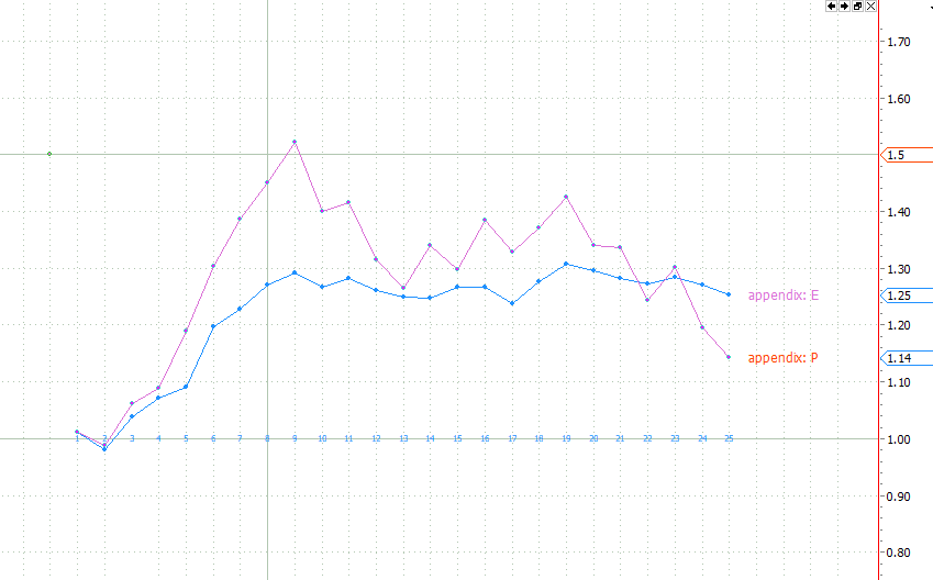The chart above gives a comparison between the two calculation methods. Dave Bergstrom used a calculation similar to the APPENDIX_E indicator, using the ratio of the favourable and adverse excursion. I am more tending to use the APPENDIX-P, the profit factor based calculation. But as you can see both methods yield similar results.